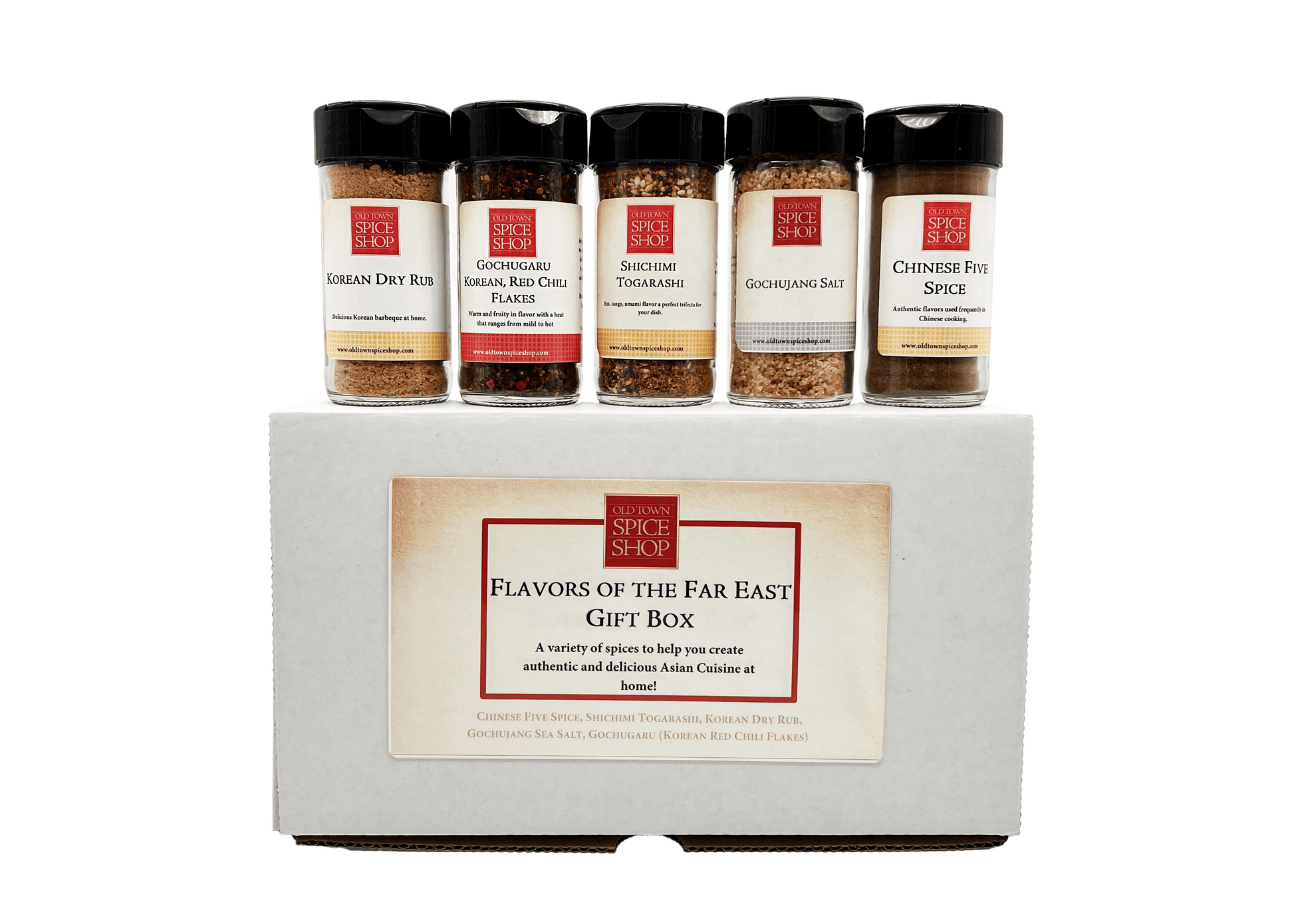 1.7 oz Jar Chinese Five Spice, 2.2 oz Jar Shichimi Togarashi, 2.2 oz Jar Korean Dry Rub, 3.3 oz Jar Gochujang Sea Salt, 1.6 oz Jar Gochugaru (Korean Red Chili Flakes)